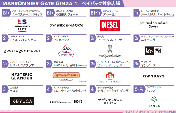 マロニエゲート銀座1 B1F~9F全店舗(3Fスターバックスコーヒー、4Fシープラプレミアム除く)