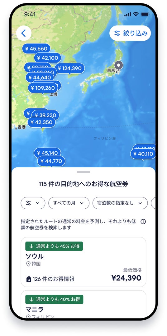 2026年2月より提供を開始したアプリ内機能「フライトディール」では、常時数百万件のフライトデータを分析し、出発空港を指定するだけで通常想定価格より20%以上お得な航空券を簡単に検索できます。過去の価格データや市場動向をもとにお得な航空券を判定し、乗り継ぎが2回以上発生するルートや、極端に待ち時間が長いフライトは自動的に除外。さらに、目的地ごとの航空券価格を地図上で比較できるマップ機能や、希望の目的地と日程を登録すると新たにお得な航空券が出た際に通知を受け取れるアラート機能など、旅行計画を効率化する機能も搭載しています。