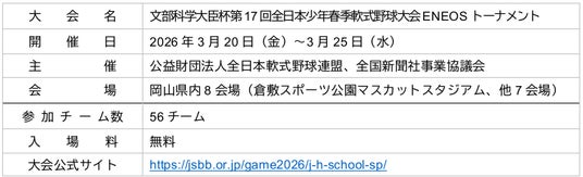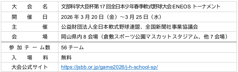 ENEOS株式会社(以下、「ENEOS」)が協賛する「文部科学大臣杯 第17回全日本少年春季軟式野球大会 ENEOSトーナメント」が、3月20日(金)から3月25日(水)にかけて、岡山県で開催されますので、お知らせいたします。