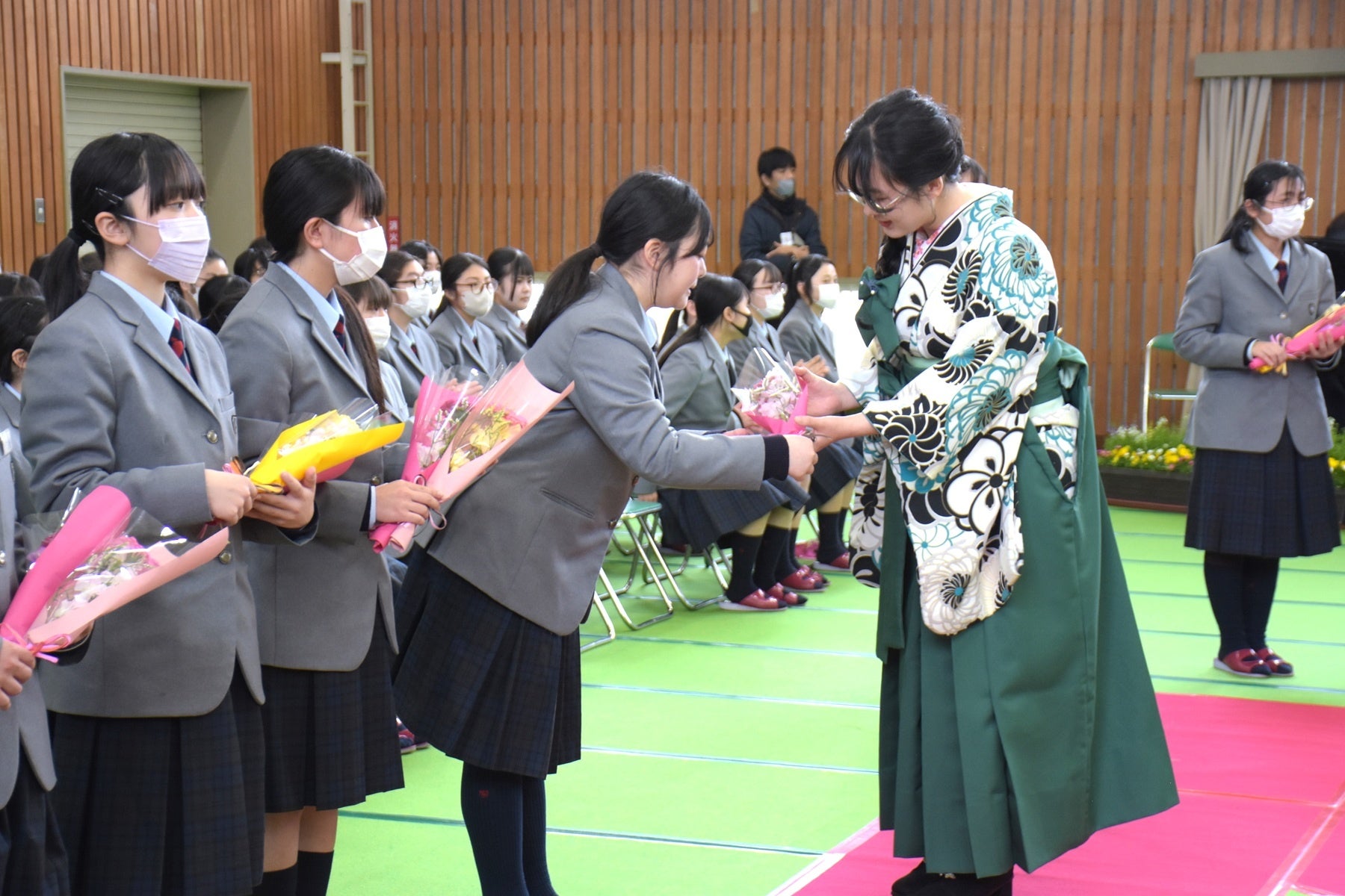 在校生から花束を受け取った卒業生は、級友たちとの思い出を胸に、体育館を後にしました。