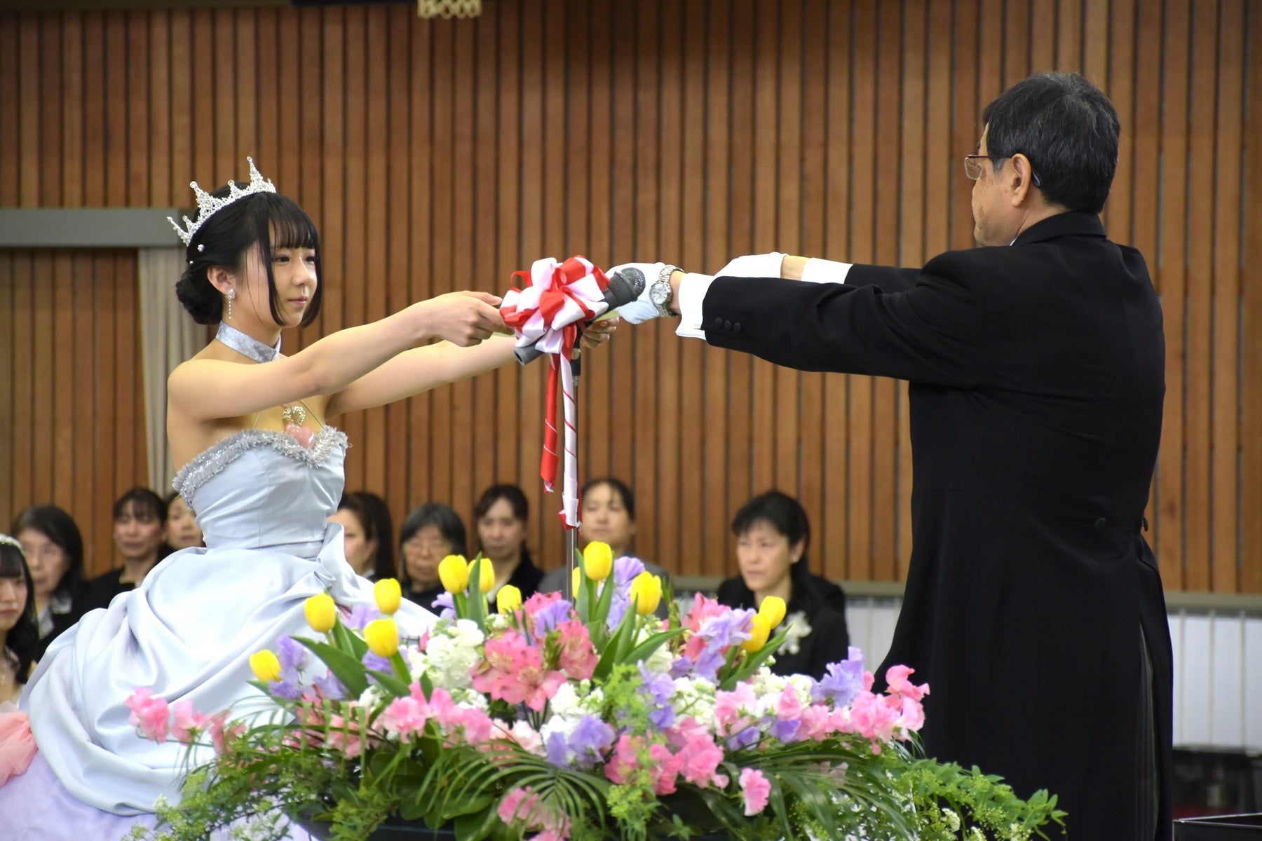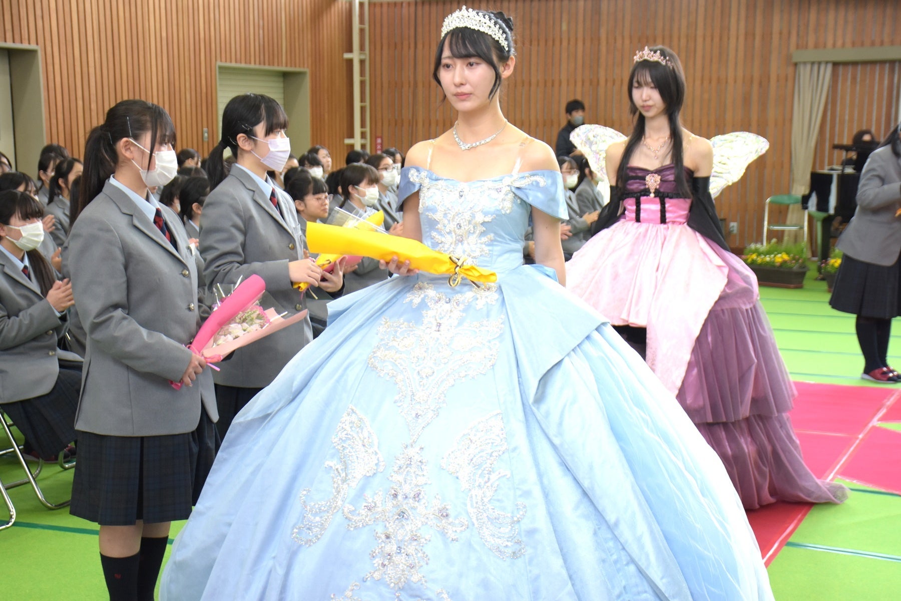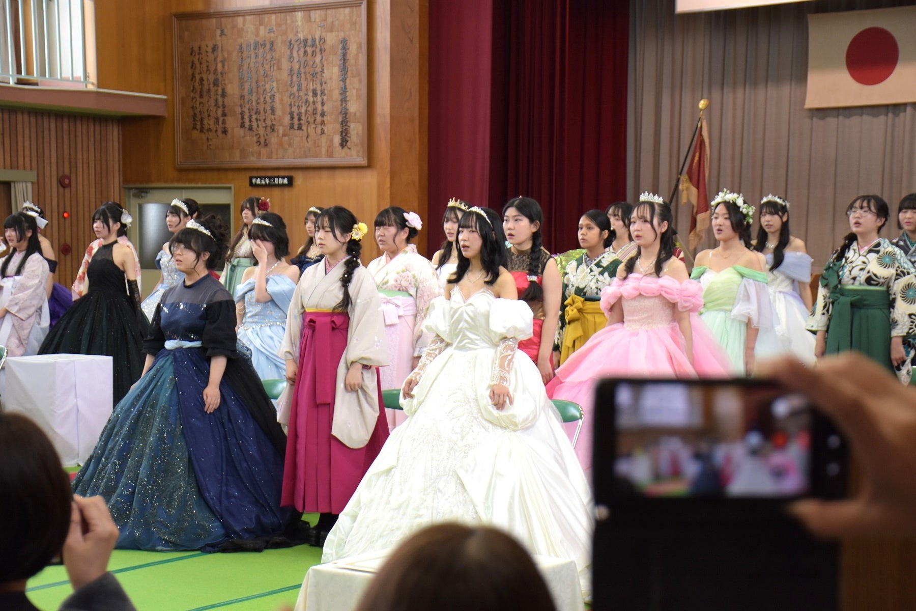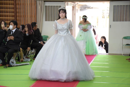 卒業生たちは3年間の学びの集大成として、自作したドレスや着物に身を包み、凛々しい表情で式に臨みました。