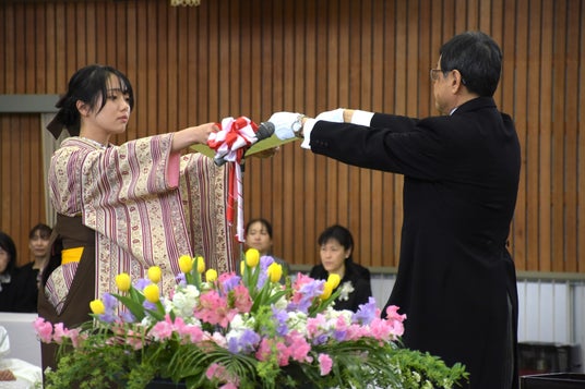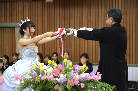 「この学校で学んだことすべてが、皆さんの人生を豊かにする大きな力になると思います。さらには、人々に感動を与え、幸福にするものでもあります。ぜひ、自信と誇りを持ってこの学校を巣立ってください。これからは、社会との関わりの中や、家庭の中でその力を発揮し、人生をより充実した豊かなものにしていってください。職員一同、皆さんの新たな世界での活躍を期待しています」