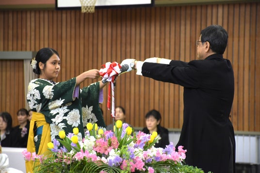 宮林校長は、茶道を学んできた卒業生に対して、昨年8月にこの世を去った裏千家十五代家元の千玄室さんが尽力してきた茶道を通した平和活動に触れ、式辞を述べました。