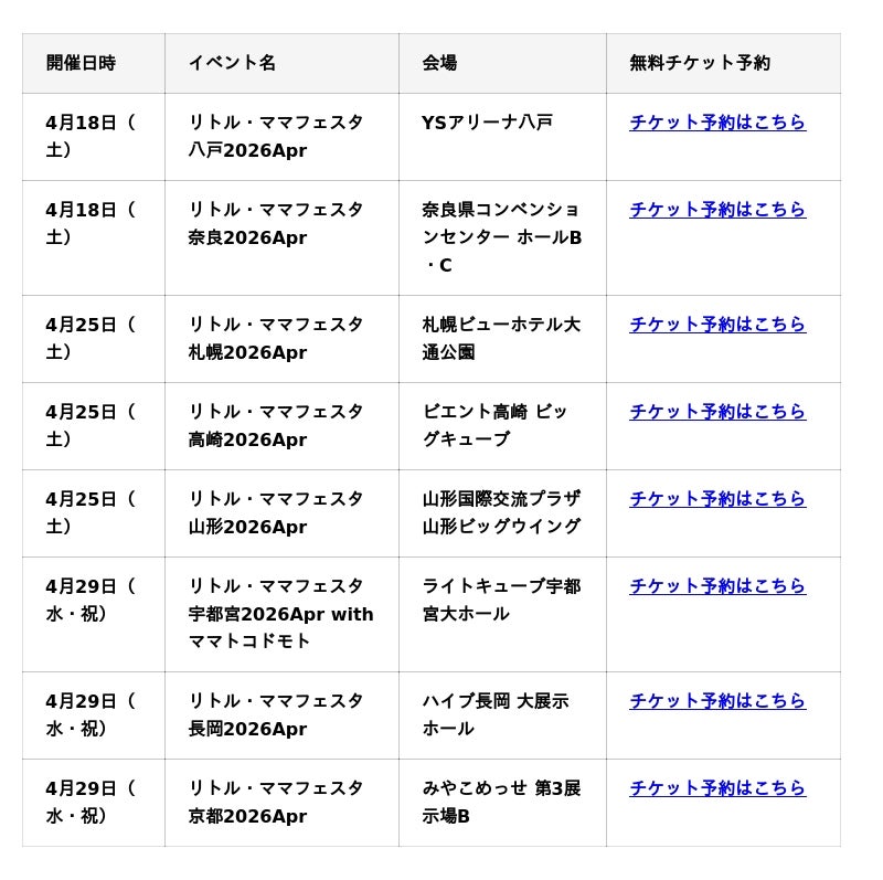 国内最大規模の親子フェスタを開催する株式会社エンファム.(東京本社:東京都港区、福岡本社:福岡県福岡市、代表取締役:森 光太郎)は、4月18日(土)八戸・奈良、4月25日(土)札幌・高崎・山形、4月29日(水・祝)宇都宮・長岡・京都の8都市にて、親子向けイベント【リトル・ママフェスタ】を開催いたします。ママ・パパとお子さまとの『思い出づくりの場』として、ご家族皆様でお楽しみください。