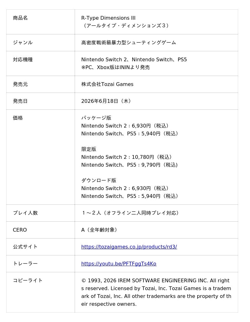 株式会社Tozai Games (神奈川県川崎市、代表取締役: 坂野 拓也、以下、Tozai Games)は、 「R-Type Dimensions III(アールタイプ・ディメンションズ3)」のパッケージ版、限定版、ダウンロード版をNintendo Switch 2、Nintendo Switch およびPlayStation 5向けに2026年6月18日に発売することを発表致しました。パッケージ版と限定版は2026年3月12日より予約の受付を開始致します。