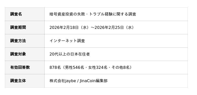 株式会社jaybe(本社:香川県高松市、代表取締役:水澤 誉往)が運営する暗号資産(仮想通貨)ニュースメディア「JinaCoin」(https://jinacoin.ne.jp/)は、20代以上の日本在住者878名を対象に、暗号資産投資における失敗・トラブル経験に関するインターネット調査を実施しました。