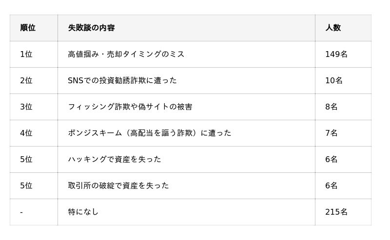 暗号資産を現在または過去に保有したことがある430名のうち、215名(約半数)が何らかの失敗やトラブルを経験していることが明らかになりました。