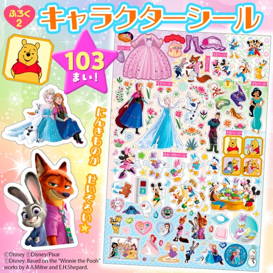 大人気『ズートピア2』のジュディ&ニックほか、エルサ、アナ、ディズニープリンセスをはじめ、キャラクターシールがたっぷり103枚つき!