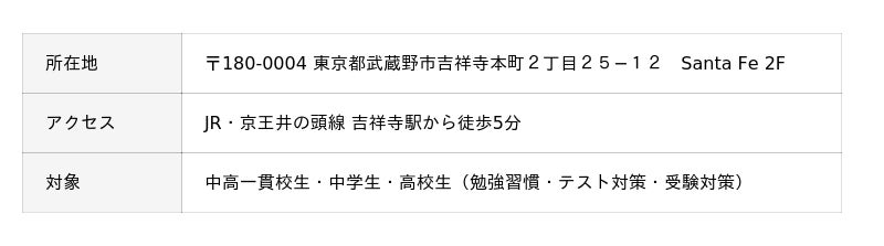 住みたい街として高い人気を誇り、教育意識の高いご家庭が集まる吉祥寺エリア。駅から徒歩5分の通り沿いに位置し、通塾のしやすさと落ち着いた学習環境を両立しています。