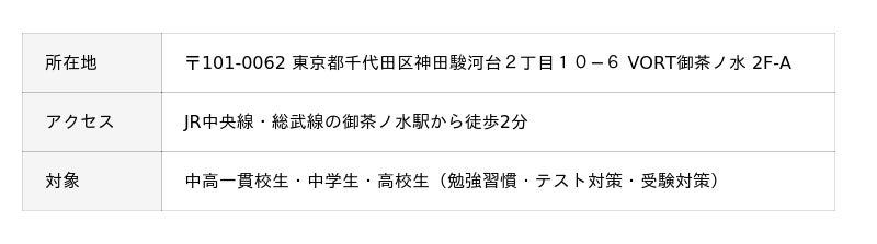 千代田区・文京区に隣接し、多くの進学校が集まるお茶の水エリアにおいて、学校帰りに立ち寄りやすい立地を活かし、安心して学習に専念できる環境を整えています。