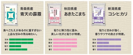 青森県産「青天の霹靂」、秋田県産「あきたこまち」、新潟県産「コシヒカリ」の3銘柄を展開。