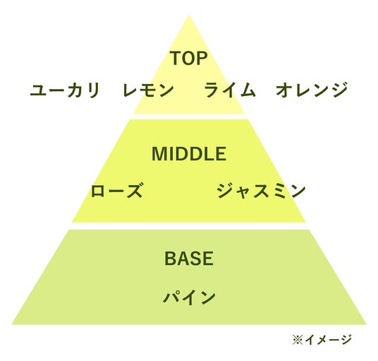ナチュラルなオレンジやレモン、ユーカリが調和した爽快なトップノートに、シトラスの果皮を想起させるライムのほろ苦さを組み合わせた、爽やかなグリーンシトラスの香りです。