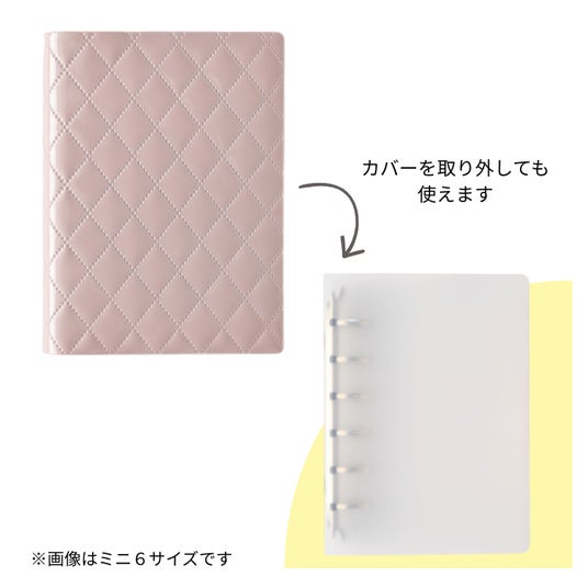 カバーを外すと梨地のシンプルなバインダーに。さらに軽く・持ち運びがしやすくなります。バイブルサイズはグレージュ・ライラックなど春らしい5色展開です。バインディのシリーズとして初のブラックも登場。キルティング柄の表紙はシンプルデザインなので、お客様自身でアレンジも楽しめます!