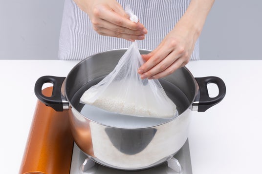アイラップに米と水を入れて湯せんするとご飯が炊ける