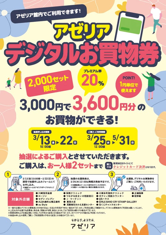 アゼリア館内でご利用いただけるデジタルお買物券を2,000セット限定で販売いたします。3,000円で3,600円分のお買物ができ、1円単位でご利用できます!ご購入はお一人様2セットまで、抽選によるご購入とさせていただきます。ご購入方法はクレジットカード決済となります。