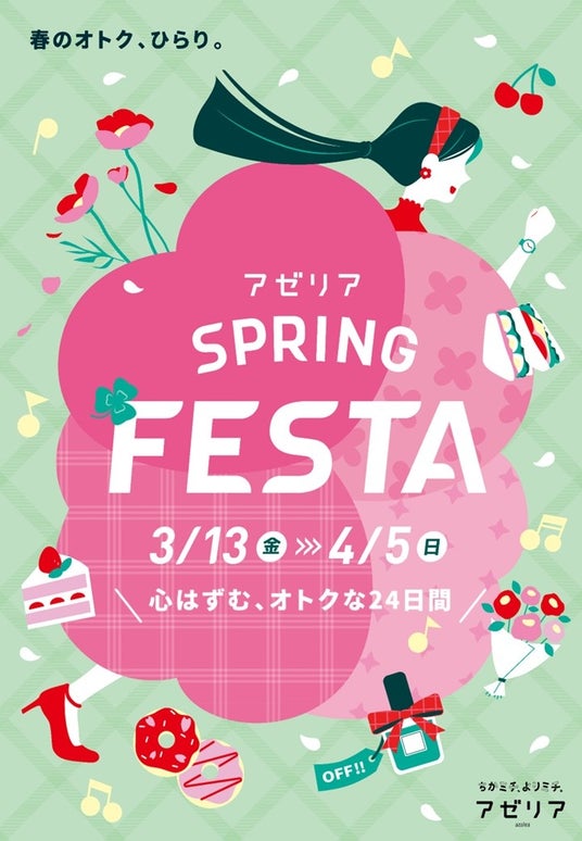 期間中、対象店舗にて、お得にお買い物ができるSPRING FESTAを開催いたします。詳細情報は館内ポスターや店頭POP、アゼリアHPにて掲載いたします。