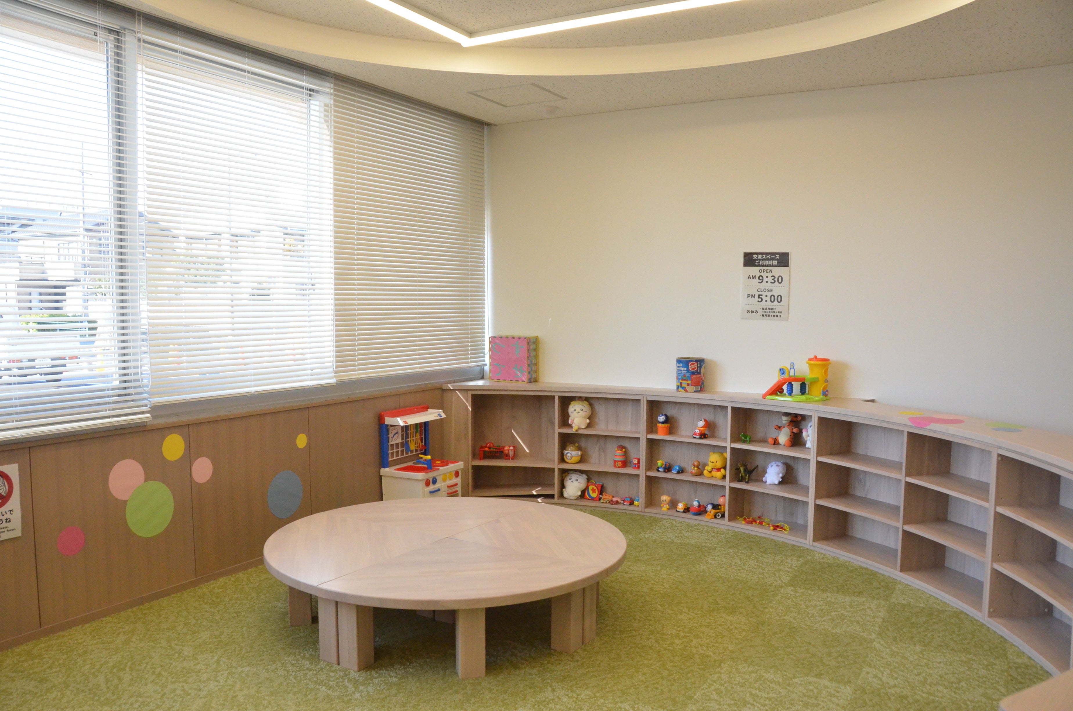 低い丸テーブル、おもちゃ、絵本がそろい、自由に過ごせる憩いの空間です。