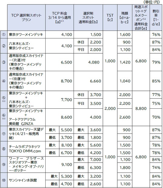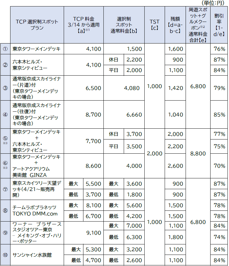 ※1 TST は3/14 からの価格改定後の金額を反映済(今回の周遊スポットおよびグルメクーポンの追加による価格改定はございません)。