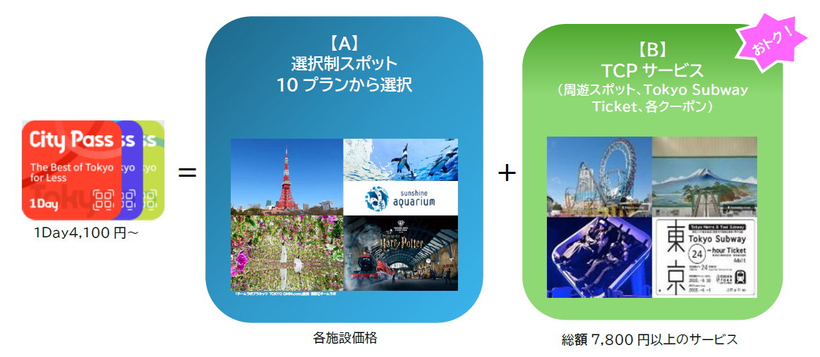 「Tokyo City Pass」は、メインとなる観光施設を選択いただく【A】選択制スポットと、総額7,800円分以上の【B】TCPサービスをセットにして、通常版4,100円からご利用いただけるおトクな観光チケットです。