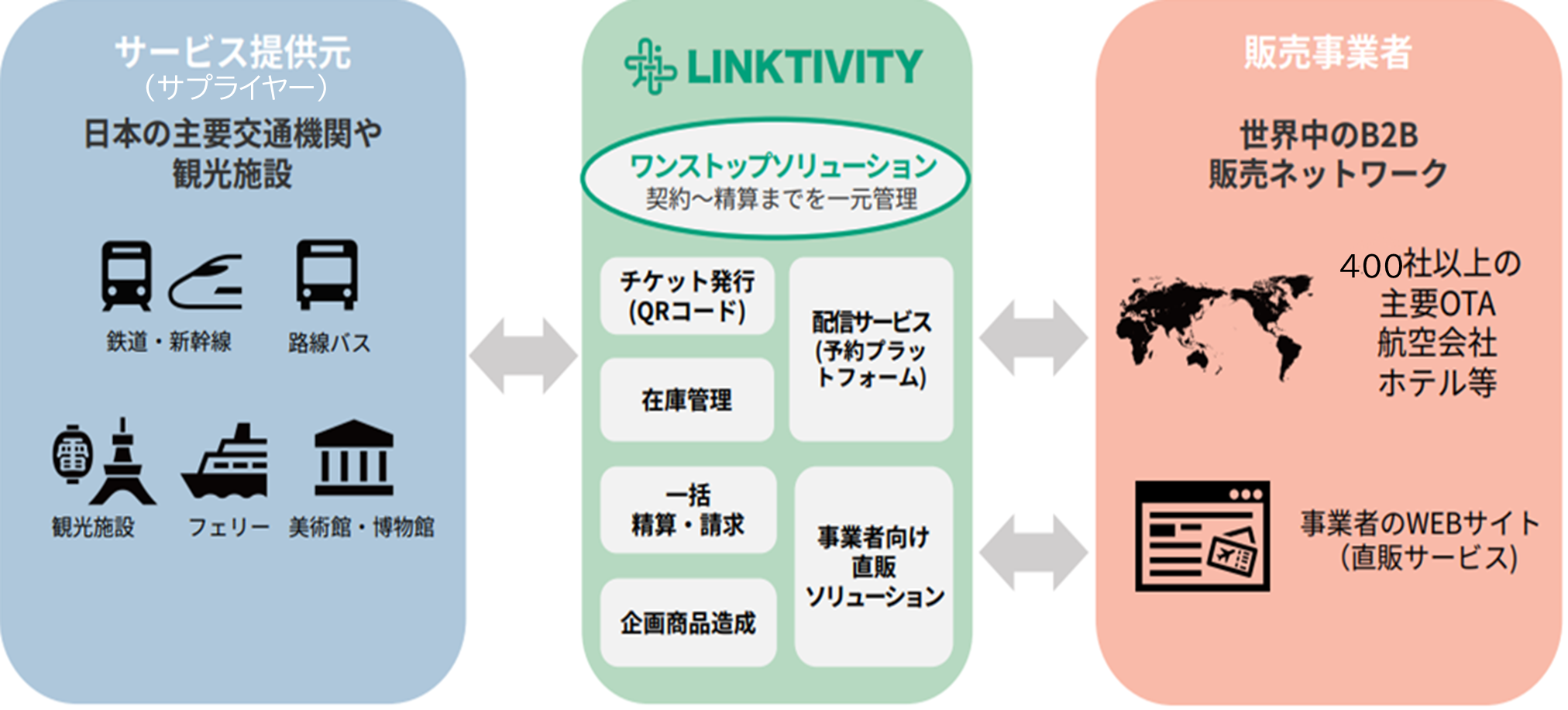 リンクティビティは、鉄道・バスなどの交通機関や観光施設と、世界中の旅行会社・Online Travel Agency(以下「OTA」)をつなげるチケットのBtoB取引プラットフォームや、交通・観光事業者・自治体に各種業務効率化サービスを提供しています。