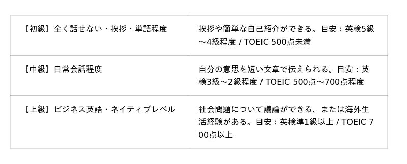 講座は【初級 / 中級 /上級】の全3クラス。学習テーマ、英語フレーズ、担当ファシリテーターの詳細をスケジュールからご確認いただき、ご希望の枠を予約できます。