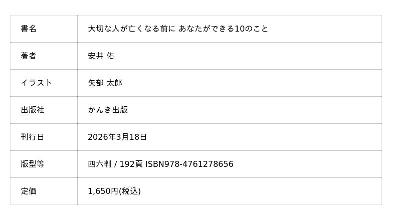医療法人社団 焔(東京都板橋区 理事長 安井佑)が運営するTEAM BLUEは、安井 佑 著『大切な人が亡くなる前に あなたができる10のこと』(イラスト:矢部太郎)を、かんき出版より2026年3月18日(水)に刊行いたします。