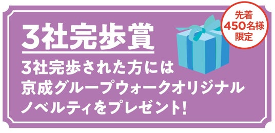 当イベントは、ウォーキングを楽しみながら、京成グループ鉄道3社の沿線地域の魅力や見どころを発見していただくことを目的として開催するものです。各社が主催するイベントにご参加いただいた方には、各コースでデザインの異なる「オリジナル缶バッジ」をプレゼントいたします。また、全てのコースにご参加いただいた先着450名様に、当イベント限定オリジナルノベルティグッズをプレゼントするほか、抽選で30名様に「サントリー天然水550mlペット」飲料1ケース(24本入り)をプレゼントいたします。
