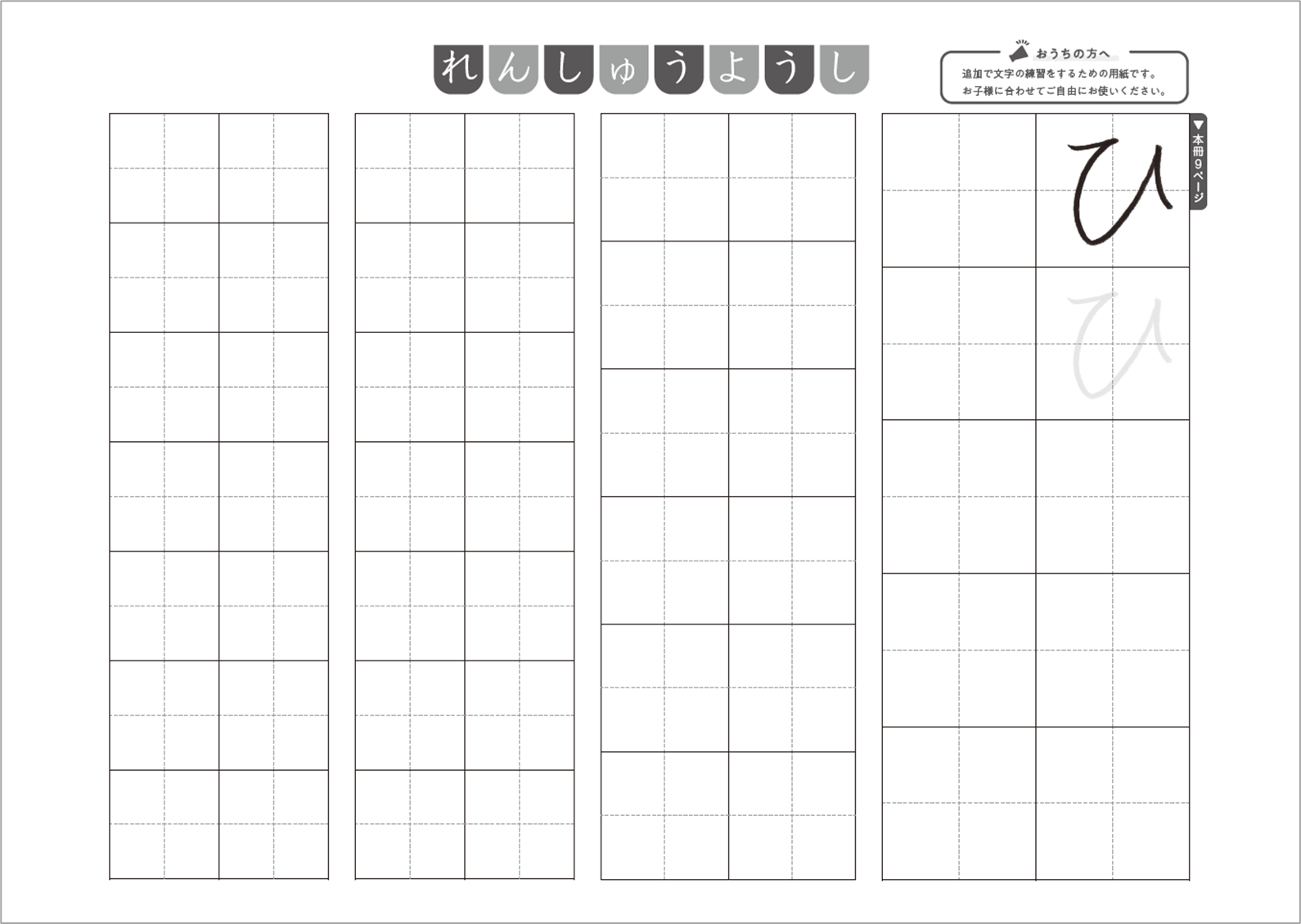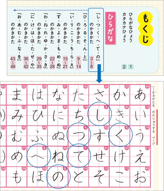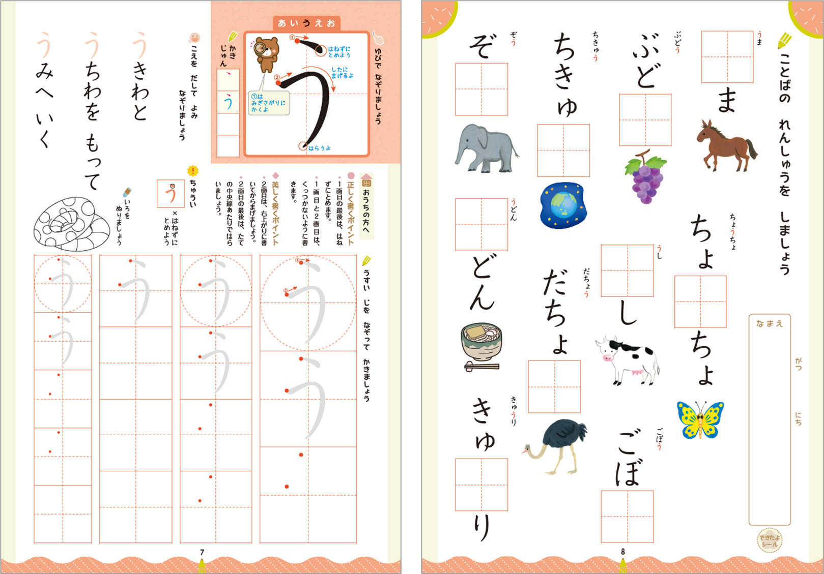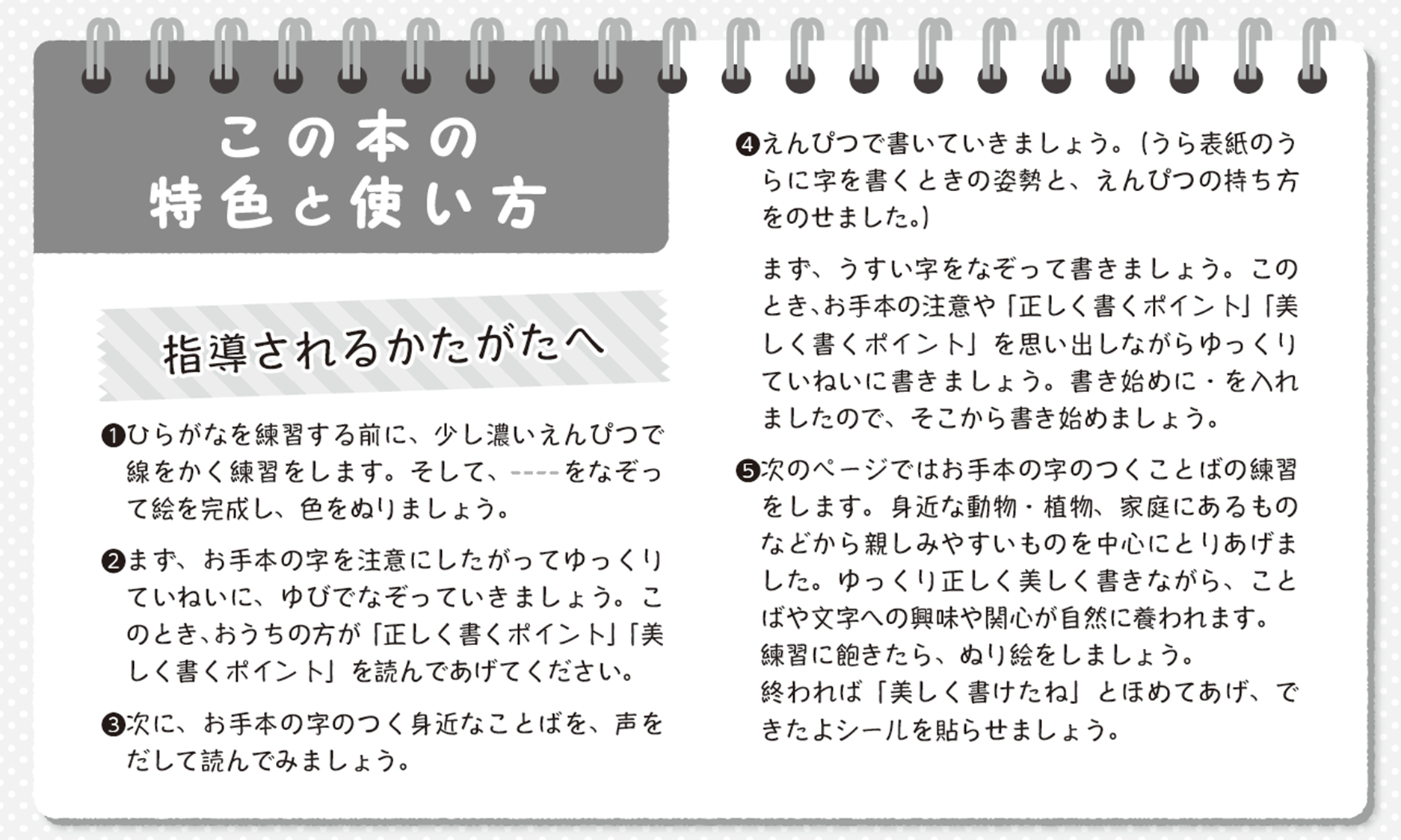 ひらがな練習ノート: https://www.zoshindo.co.jp/kindergarten/114/9784424114062.html