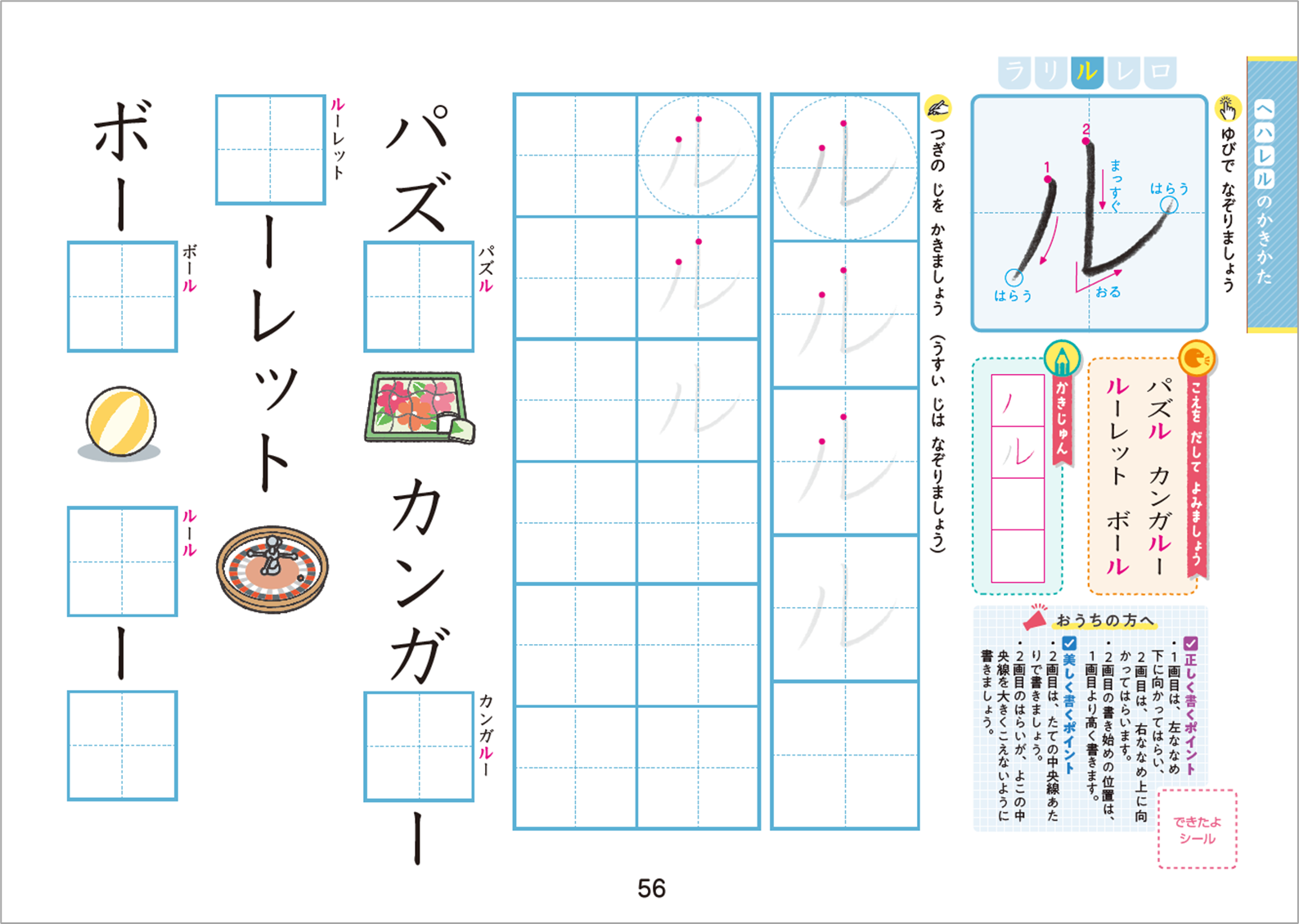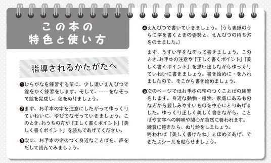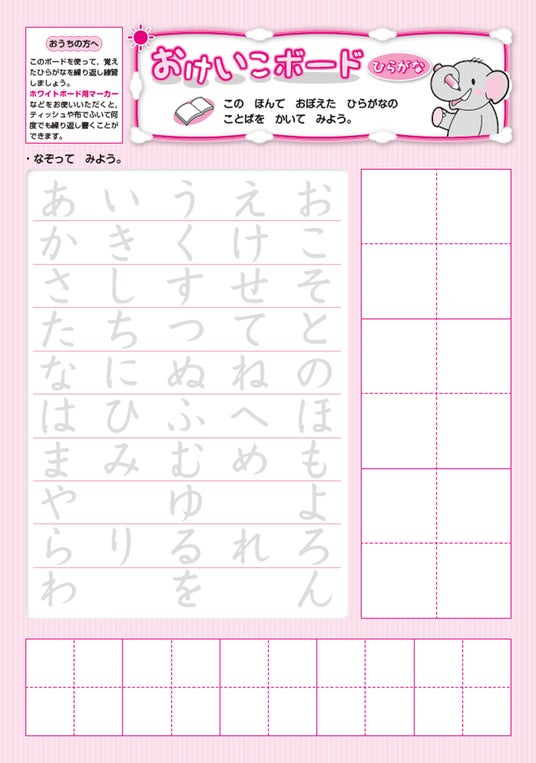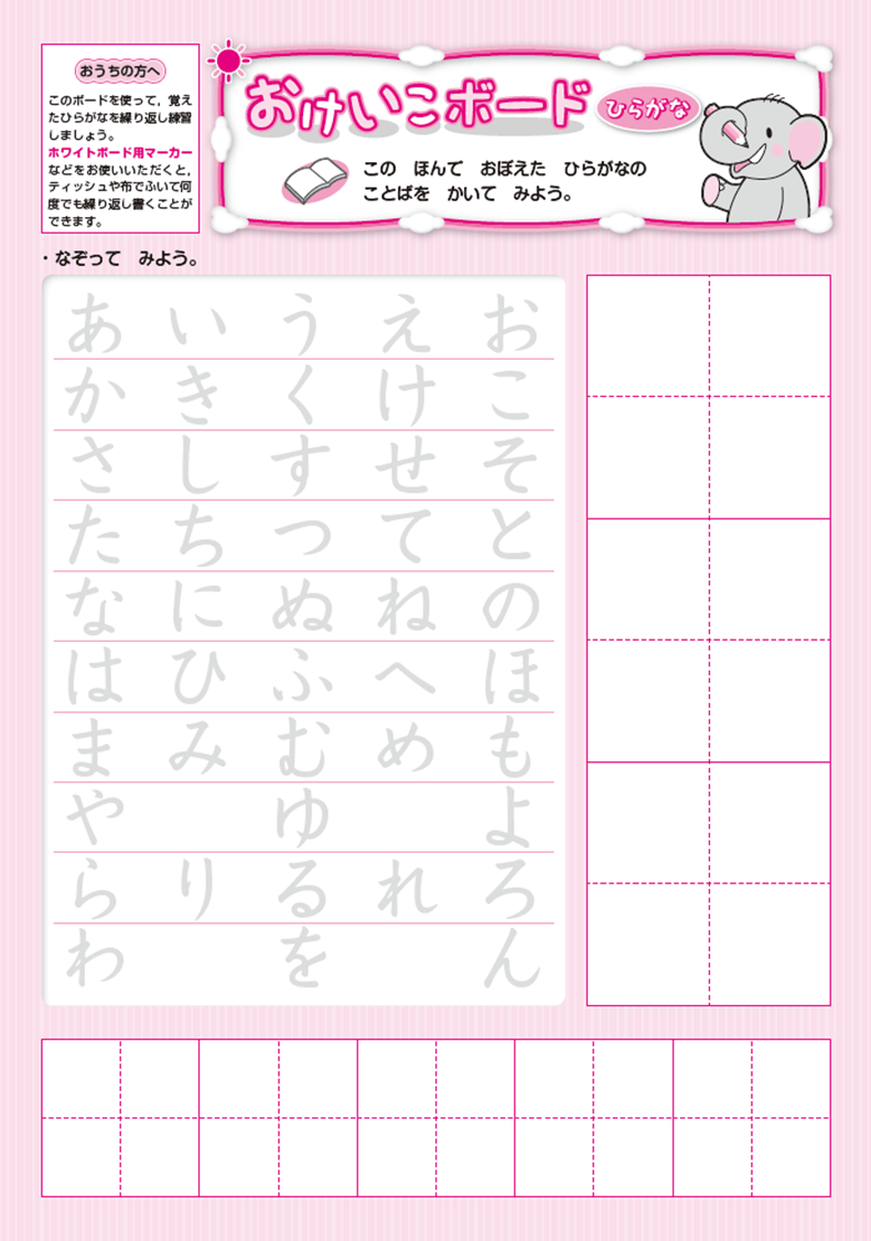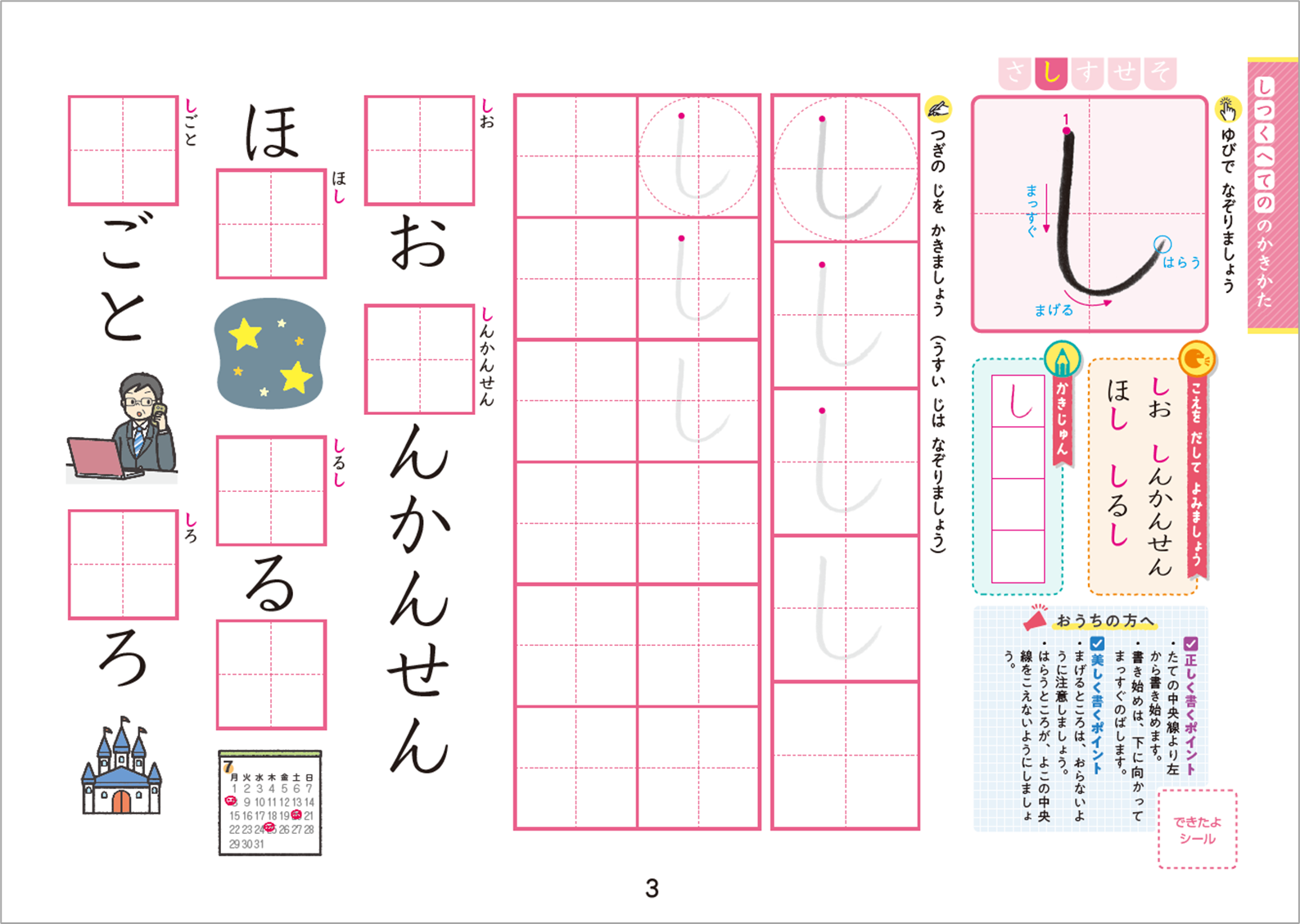 ひらがな練習ノート: https://www.zoshindo.co.jp/kindergarten/114/9784424114062.html