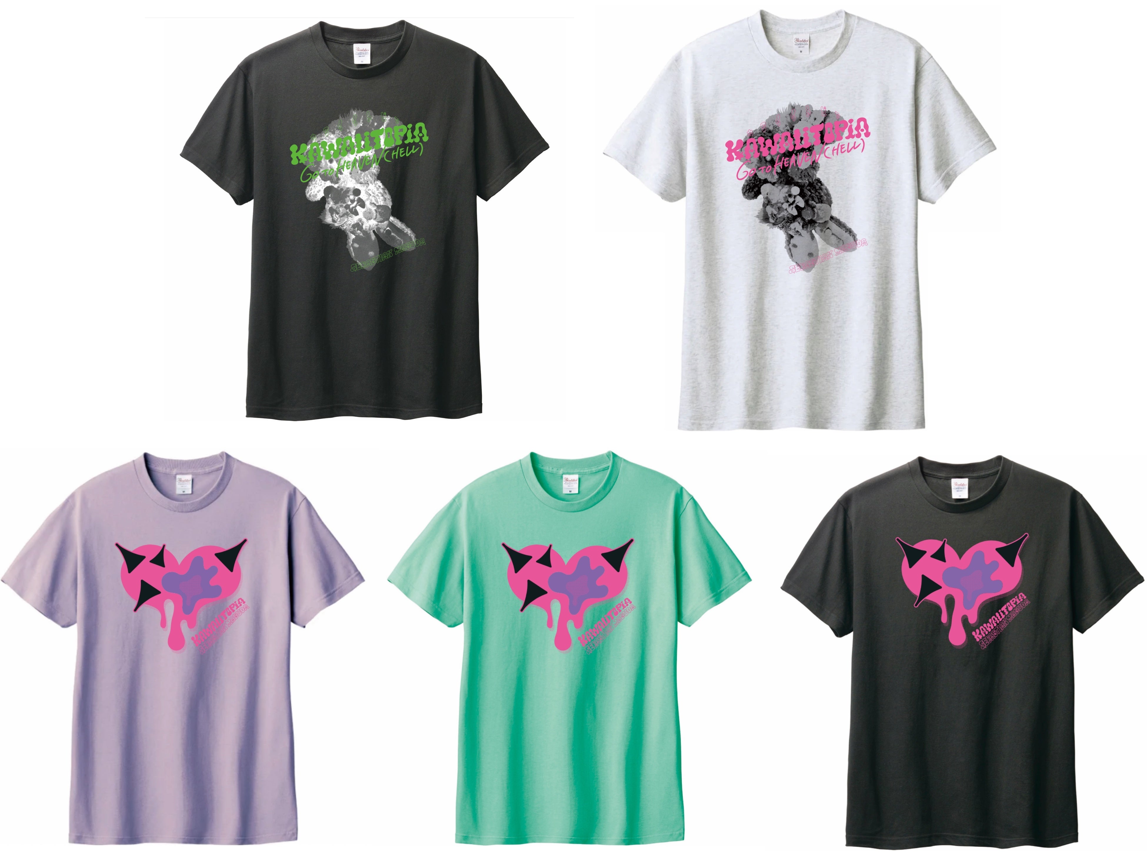 展覧会を記念して2種のTシャツが登場、展示作品の「KAWAII CORE」「Plushie Hell」をモチーフ にグラフィックに落とし込みました。