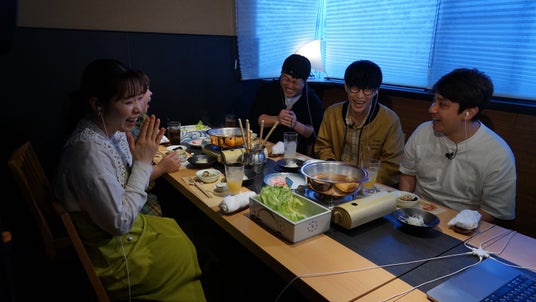 愛媛のグルメを堪能するべく4人が訪れたのは、宇和島の郷土料理や愛媛食材を使った料理が楽しめる「かどや霞邸」。店内に入ると、ふと目に留まったのは空いている1席。そこに現れたのは、スペシャルゲストのオーイシマサヨシさんでした。突然の登場に、場のボルテージは一気に最高潮に達します。さらに、オーイシマサヨシさんがシモリュウの大ファンだという新事実も明らかに。愛媛県鬼北町のキジ肉を使ったお鍋や、愛媛甘とろ豚など、次々と運ばれてくる豪華食材運に5人の興奮は止まりません。しゃぶしゃぶを頬張りながら、お肉の脂の甘みやキジ肉の旨みに感動の連続でした。