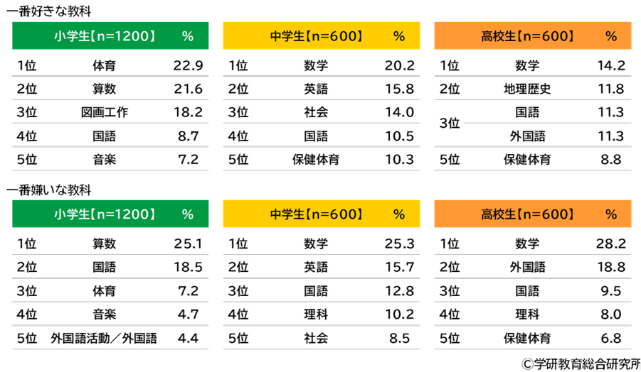 一番好きな教科をきいたところ、小学生では1位「体育」(22.9%)、2位「算数」(21.6%)、3位「図画工作」(18.2%)、中学生では1位「数学」(20.2%)、2位「英語」(15.8%)、3位「社会」(14.0%)、高校生では1位「数学」(14.2%)、2位「地理歴史」(11.8%)、3位「国語」「外国語」(いずれも11.3%)となりました。