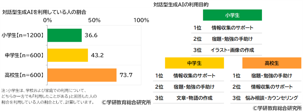 使用目的TOP3「情報収集のサポート」「宿題・勉強の手助け」「文章・物語の作成」