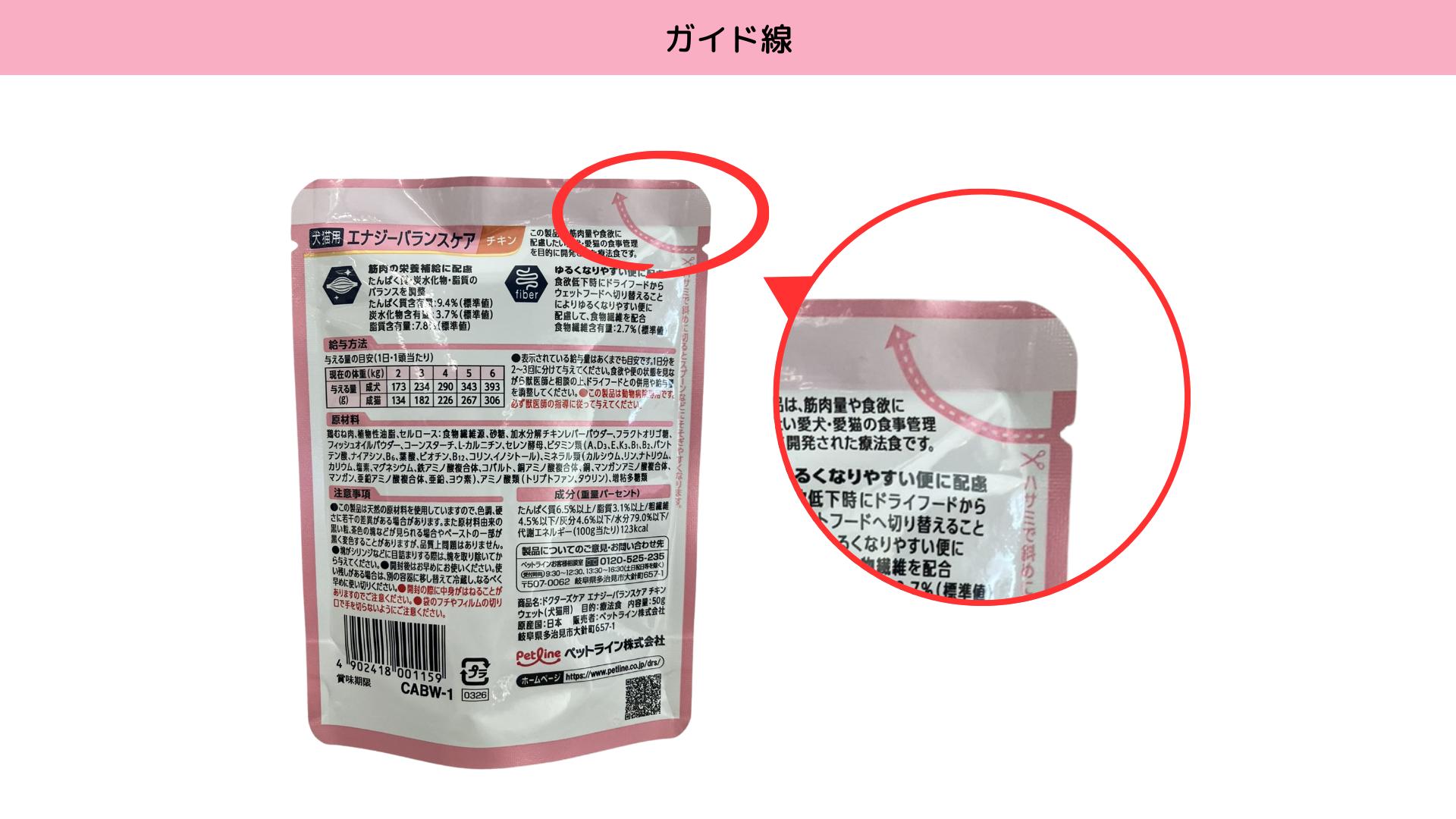 これまでの「ドクターズケア」ウェットタイプ同様、使いやすさを考慮してパウチタイプを採用しました。開封方法は2通りあり、横一直線に切ると多めに取り出したい場合に適しており、ガイド線に沿って切ると少量ずつ使用したい場合に便利です。また、「ドクターズケア」ウェットタイプで初めての「犬猫兼用」のため、一目見てわかるように犬猫両方のイラストを使用しています。