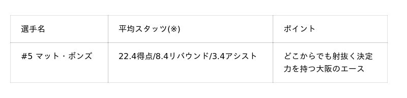 大阪の攻撃の核となるのは、平均22.4得点を叩き出している#5 マット・ボンズ選手です。どこからでも得点を狙える決定力に加え、平均3.4アシストとパスセンスも兼ね備えており、#5 ボンズ選手を自由にさせないことが勝利への鍵となります。