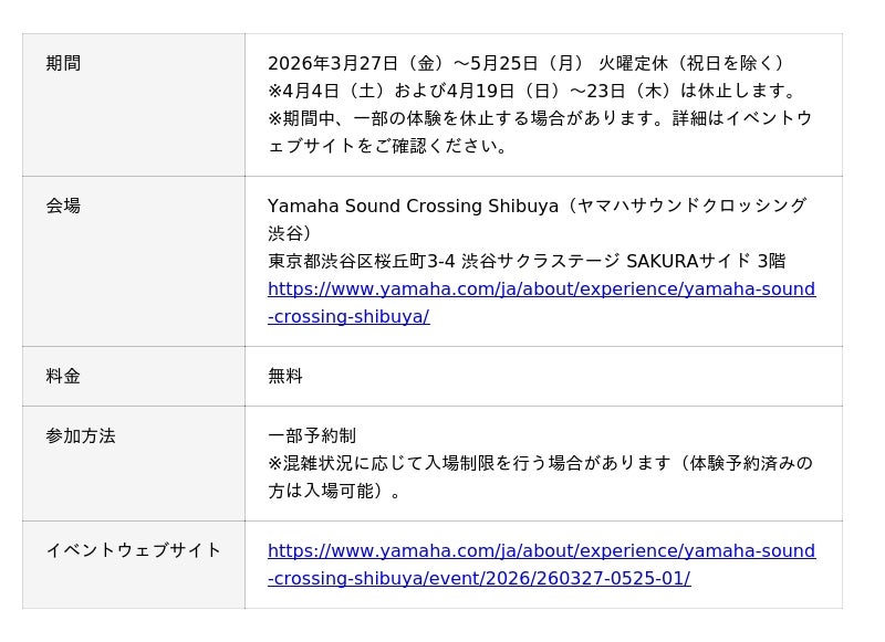 期間:2026年3月27日(金)~5月25日(月)、会場:Yamaha Sound Crossing Shibuya(ヤマハサウンドクロッシング渋谷)