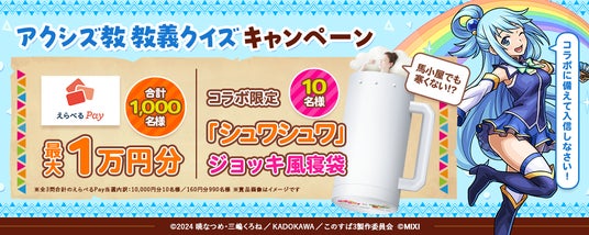 モンストキャンペーン公式 Xアカウント(https://x.com/monst_campaign)をフォローし、期間中に投稿される「アクシズ教教義クイズ」に参加。指定のハッシュタグをつけて正解だと思う選択肢とコメントを添えて引用ポストすると、さまざまなスマホ決済サービスのポイントからお好きな商品を自由に選んで受け取れる「えらべるPay(R)」最大10,000円分が即時抽選で合計1,000名様に、また全3回の抽選に参加した方の中から後日抽選で、アニメ『この素晴らしい世界に祝福を!』×モンストコラボ限定「シュワシュワ」ジョッキ風寝袋が10名様に当たります。