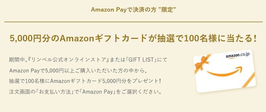 期間中に『リンベル公式オンラインストア』または『GIFT LIST公式サイト』にてAmazon Payで5,000円(税込)以上ご購入いただいた方の中から、抽選で100名様にAmazonギフトカード5,000円分をプレゼント。
