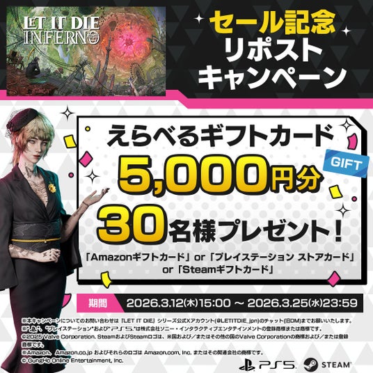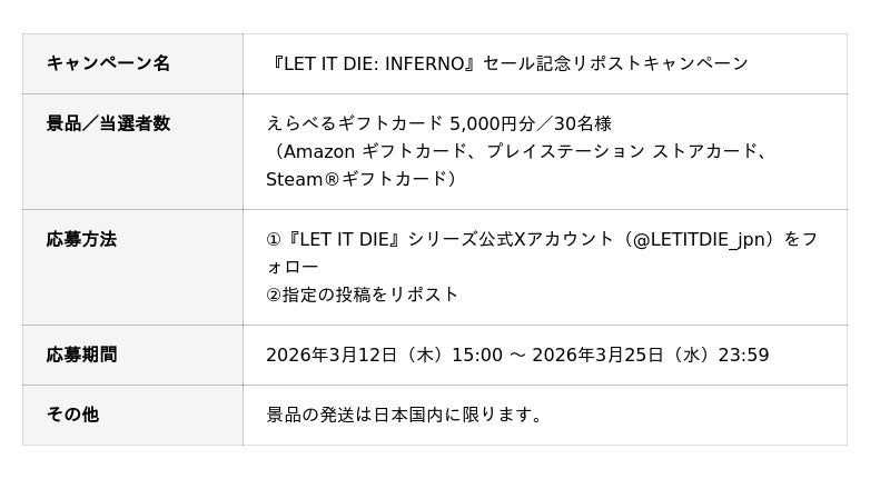 https://x.com/LETITDIE_jpn/status/2031973699440579028?s=20『LET IT DIE: INFERNO』初のセール実施を記念して、豪華景品が当たるリポストキャンペーンを開催いたします。