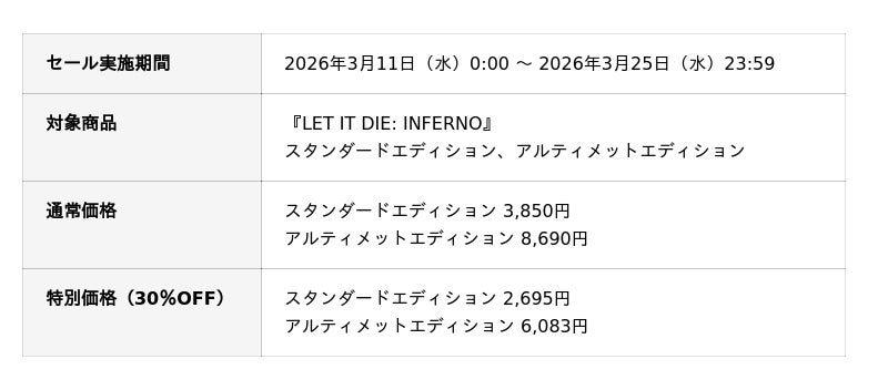 https://x.com/LETITDIE_jpn/status/2031931331035238678?s=20PlayStation(TM) StoreとSteam(R)にて、期間限定セールを実施します。シーズン2が開始したこのタイミングに、お得に『LET IT DIE: INFERNO』をご購入いただけます。地獄門でのレイダー活動を開始するのに絶好のプレイチャンスを、どうぞお見逃しなく。