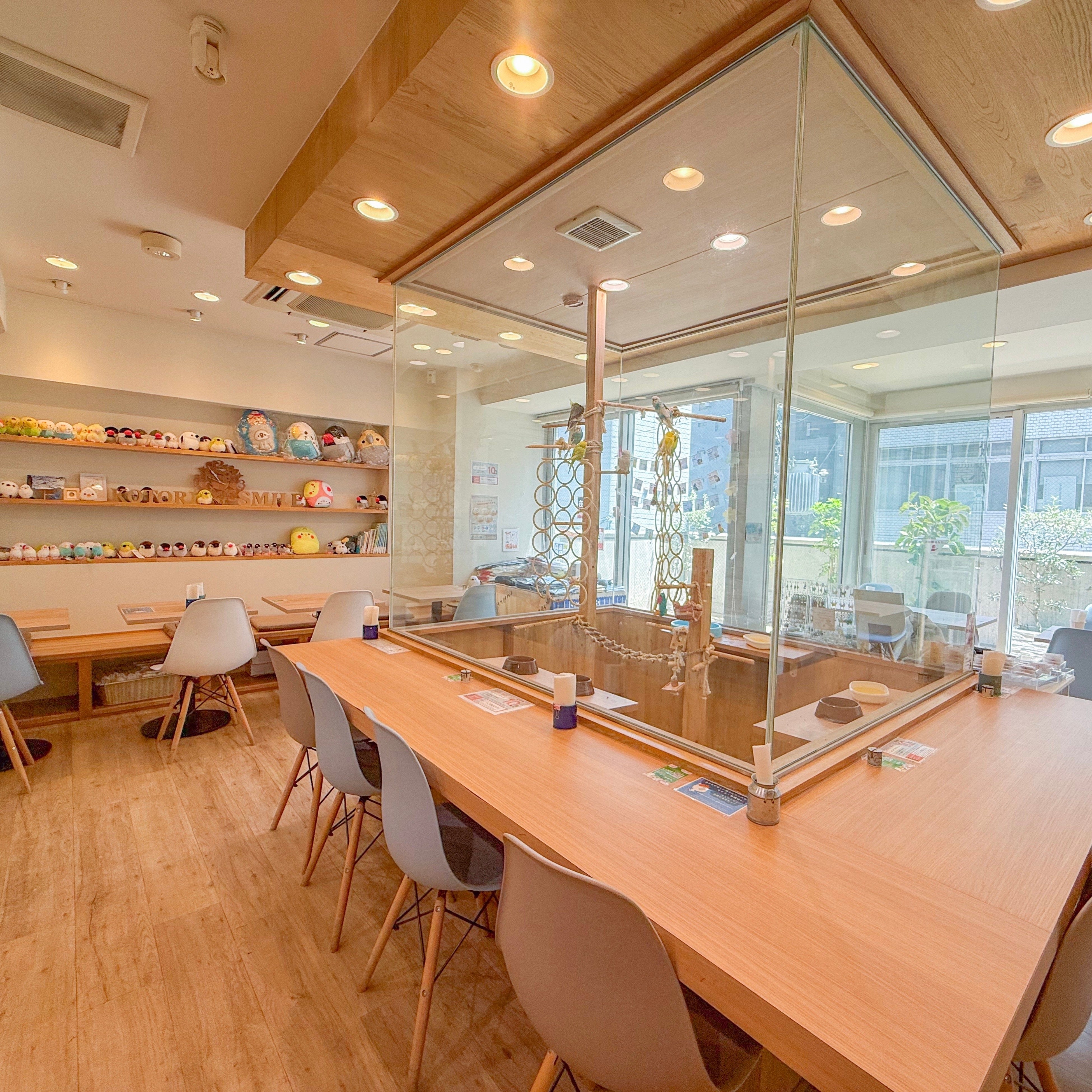 カフェと併設して鳥をモチーフにした雑貨コーナーもあり、品揃え豊富な鳥グッズを販売しております。衛生面の都合上、鳥さんとの同伴や、放し飼いはしておりません。