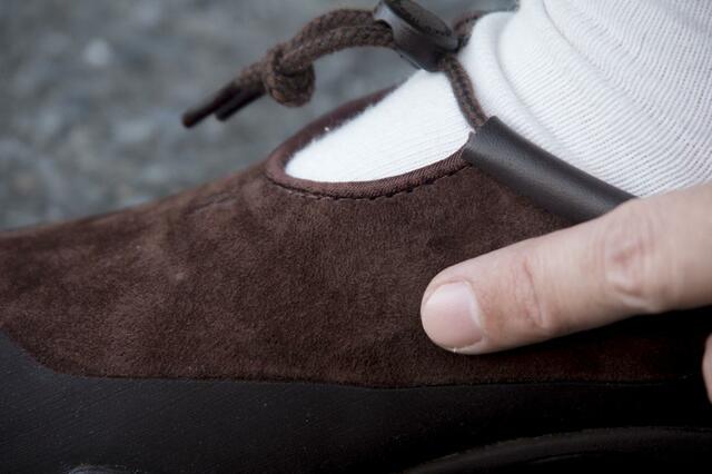 甲の部分が低く、つま先部分がラバーで覆われているのでサイズ選びには注意が必要。