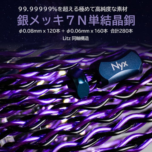 Nyx(ニュクス)は、銀メッキ7N(純度99.99999%)単結晶銅(OCC)導体を280本(φ0.08mm 120本 + φ0.06mm 160本)Litz同軸構造にした非常にリッチな構成を採用。漆黒の空の如くノイズレス、輝く星々のような鮮明さと奥行きを感じさせるサウンドが圧倒的な没入感を生み出します。星空の濃淡を表す黒、紫、青をケーブルとハードウェアに配し、新規設計部品を纏ってあなたのオーディオ環境に新たな彩りと音色を加えます。