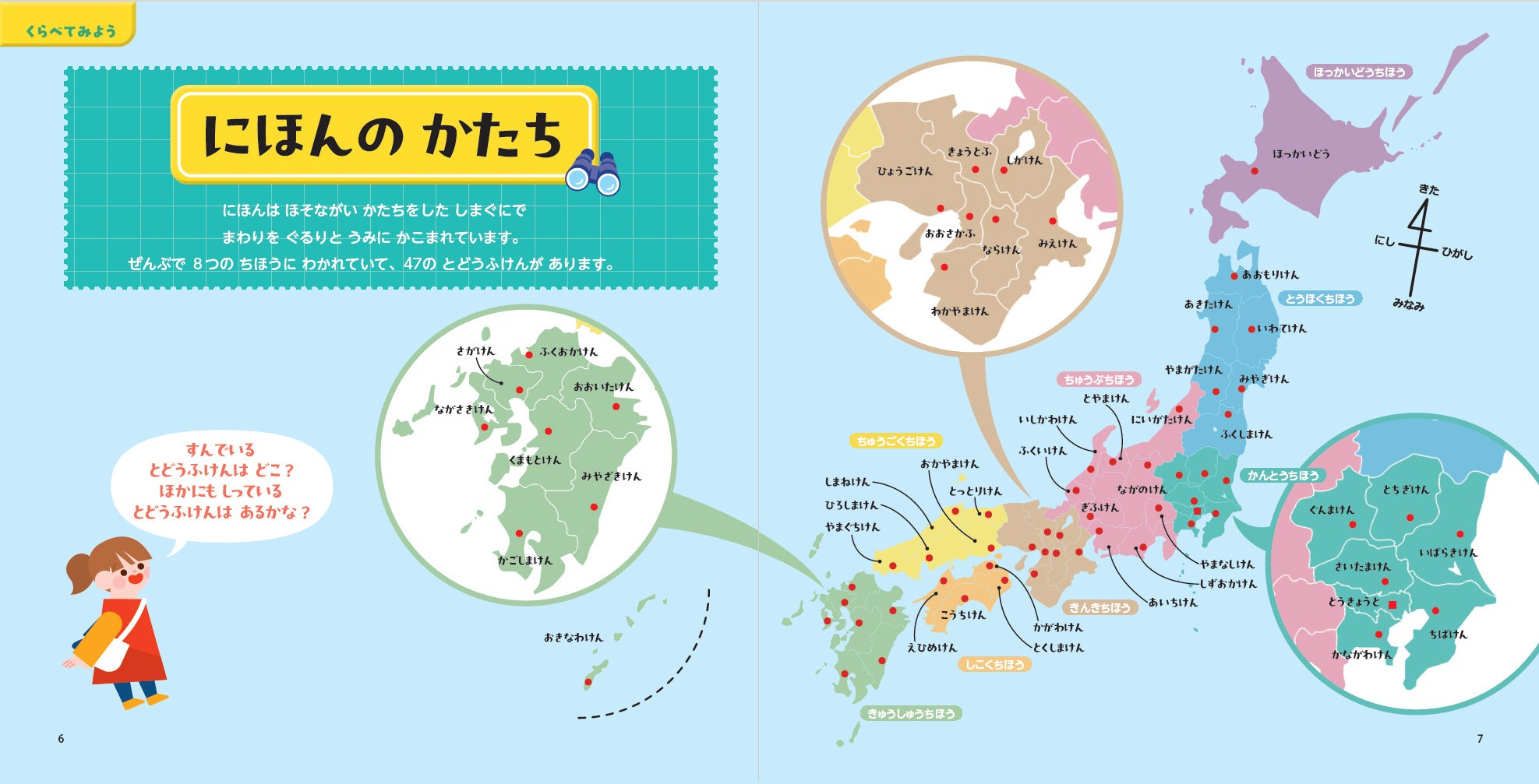各地方のはじめにはクイズを掲載。問いかけに対して子どもが自ら考えながらページをめくる設計です。
