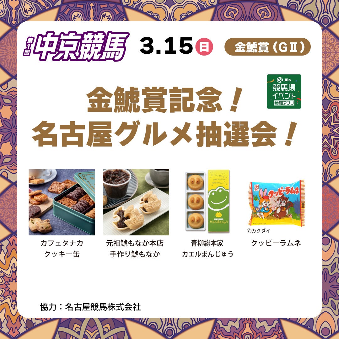 15日(日)には「金鯱賞記念!名古屋グルメ抽選会!」、22日(日)には「愛知杯記念!スポーツ応援抽選会!」を実施します。名古屋で大人気のカフェタナカのクッキー缶や、ケンコー・トキナーの双眼鏡など豪華賞品が当たるチャンス!