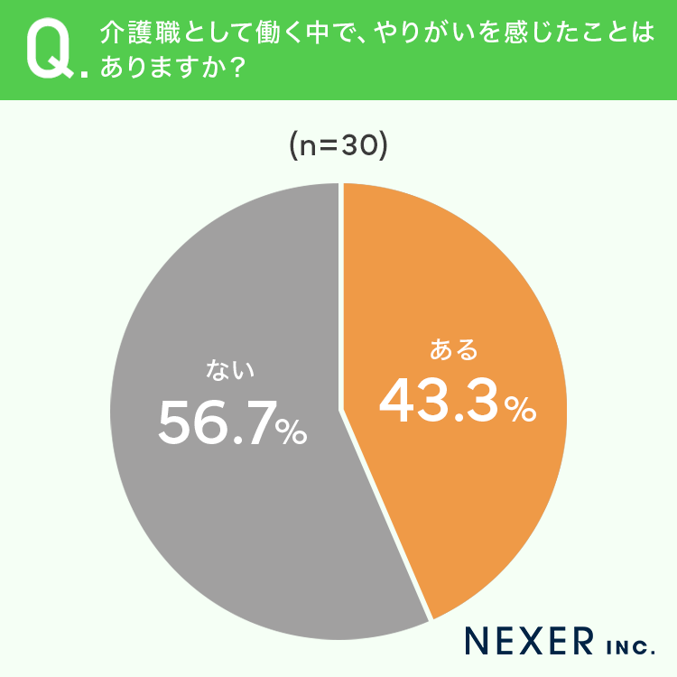 その結果「ある」が43.3%、「ない」が56.7%となりました。半数近くの方が、介護の仕事を通じてやりがいを実感しています。