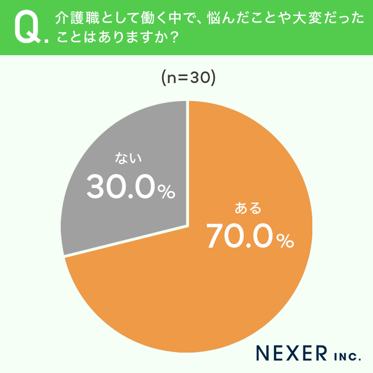 その結果「ある」と回答した方は70.0%にのぼり、「ない」は30.0%にとどまりました。7割もの介護職経験者が、何らかの悩みや困難を経験していることがわかります。