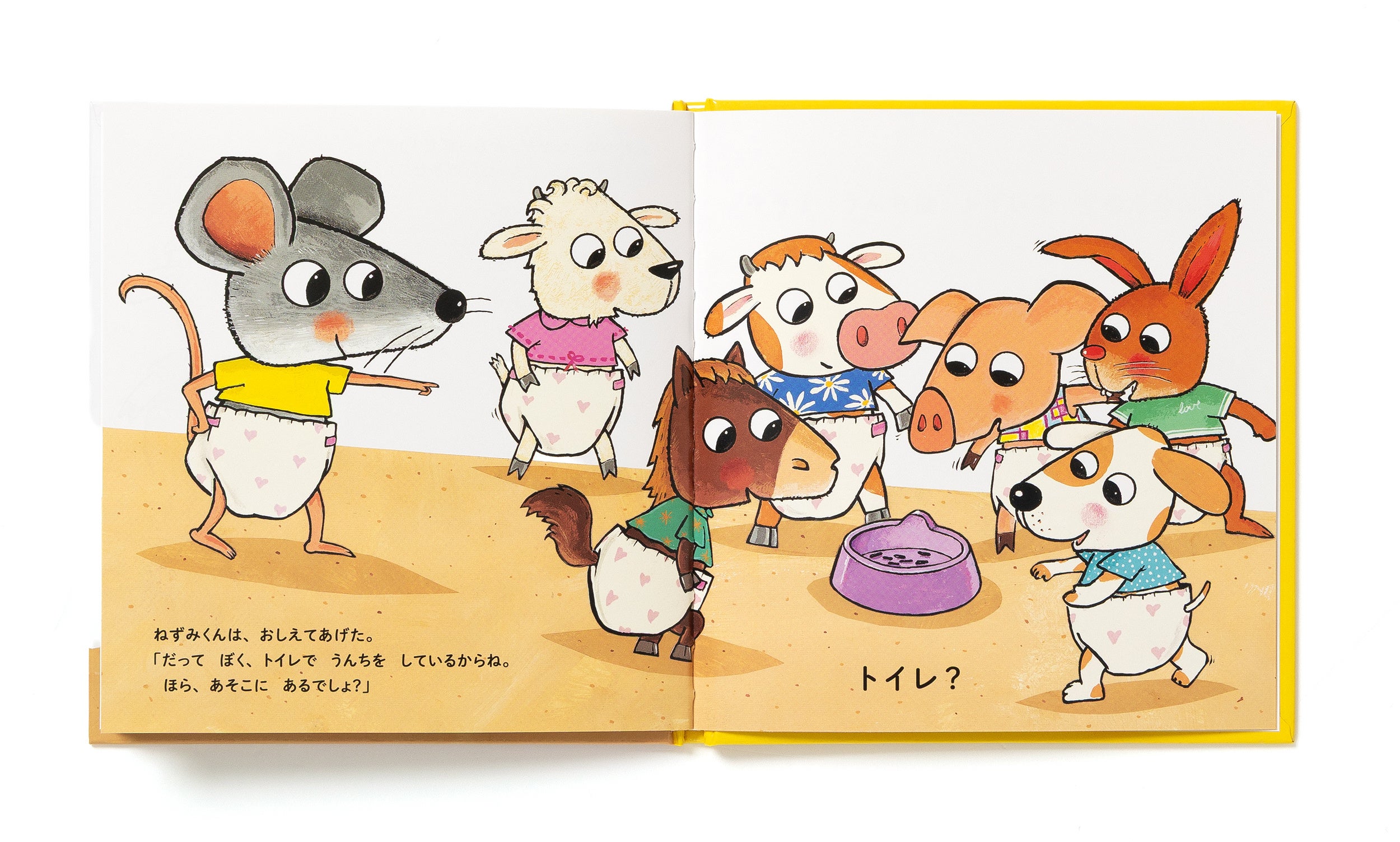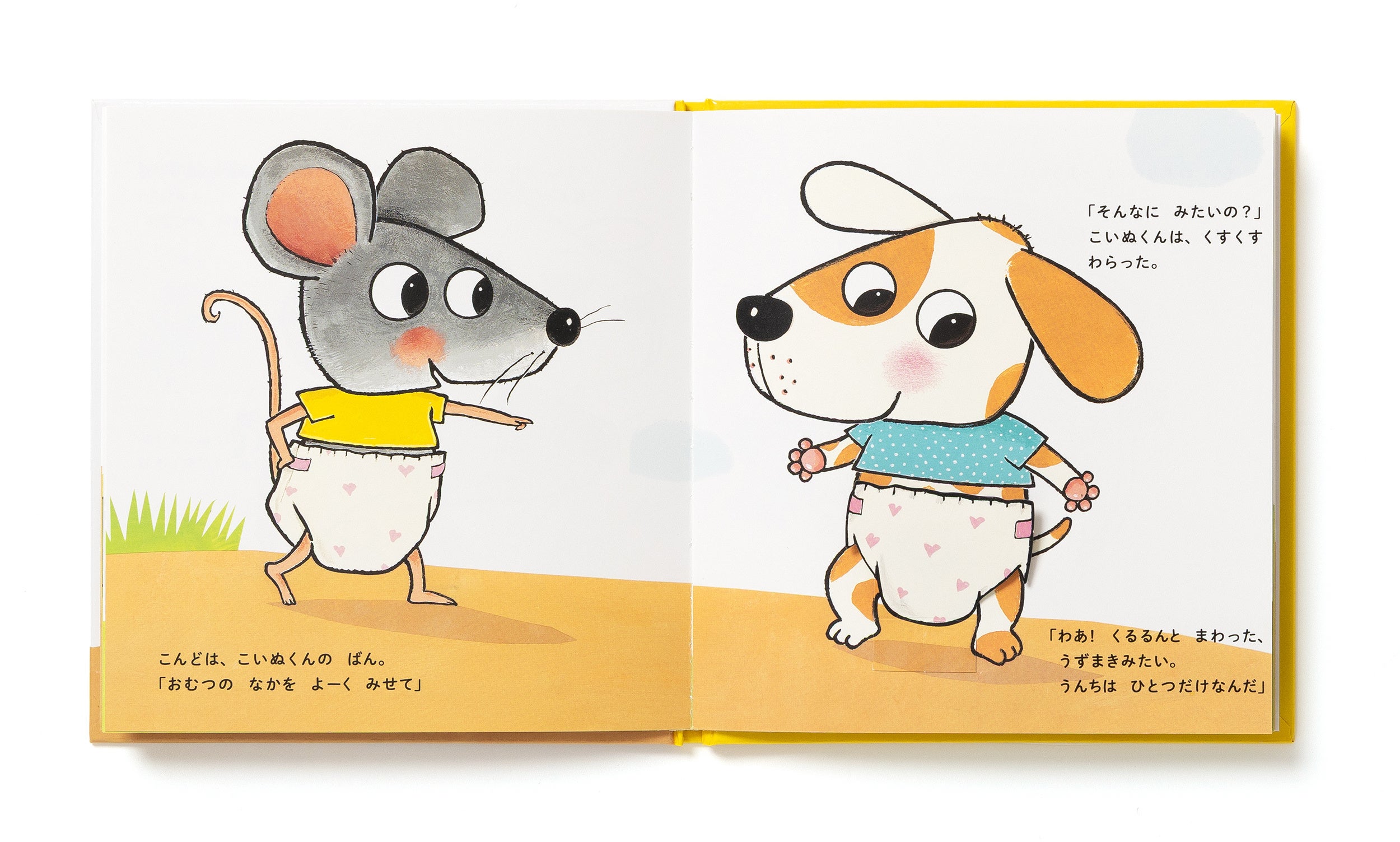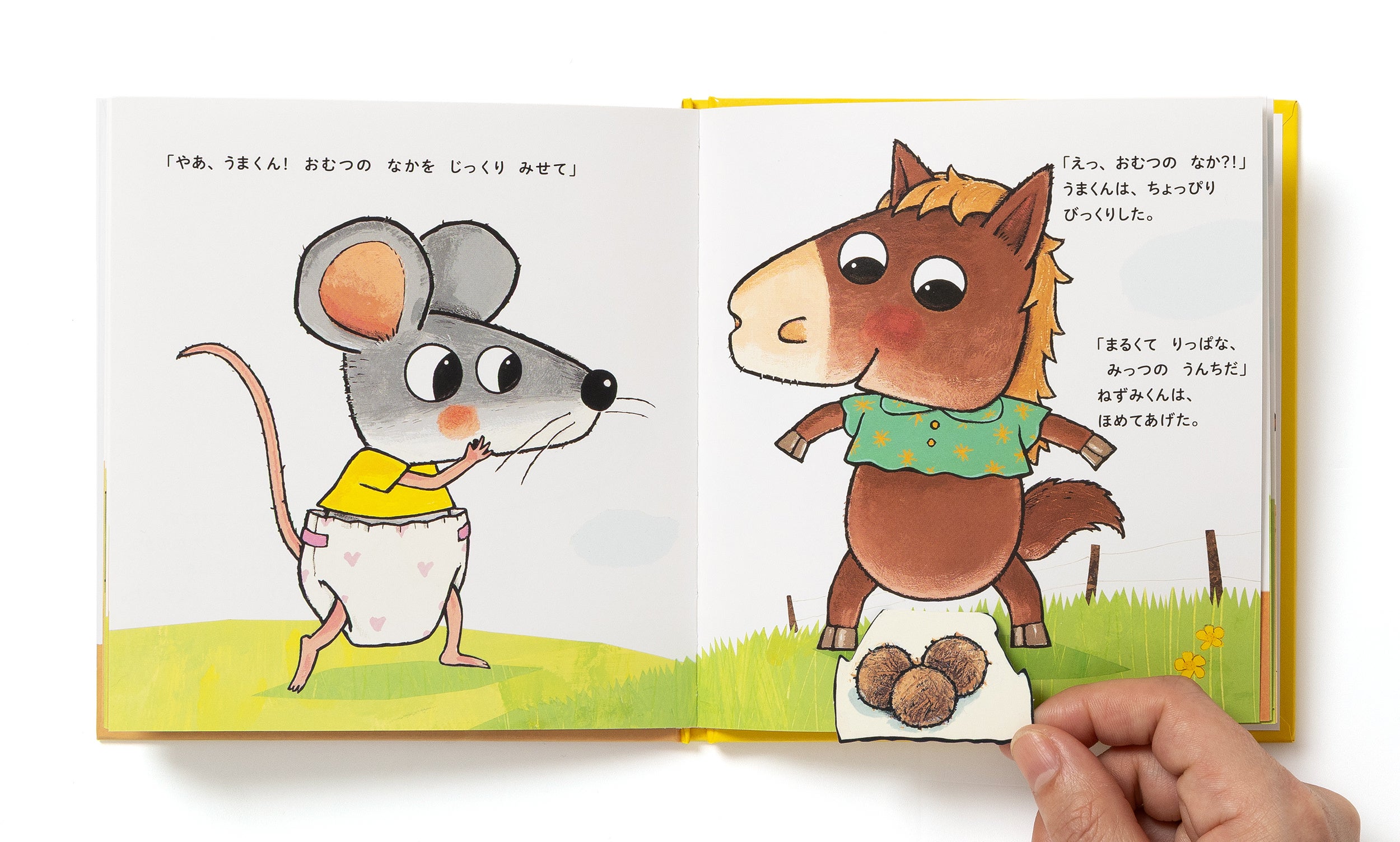 世界35ヵ国で翻訳される絵本知りたがりやのねずみくんは、みんなのおむつの中がどうなっているのか知りたくてたまらない!おむつをめくる仕掛けを楽しみながら、ウサギはコロコロうんち、ウマは大きなまぁるいうんち……と、動物のうんちの違いを知ることができる絵本。トイレトレーニングのはじめの一歩に。
