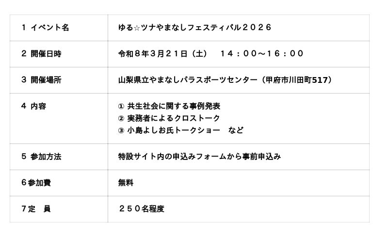 この度、「共生社会」の世界観を体現するイベントとして、「ゆる☆ツナやまなしフェスティバル 2025」を開催します。