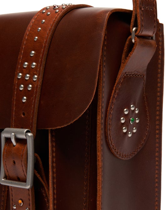 定番で非常に人気の高い7インチと11インチのサッチェルバッグをベースに、ブラックのヘアオンレザーとブラウンのワックスレザーに、スタッズをあしらった最新バックコレクション。